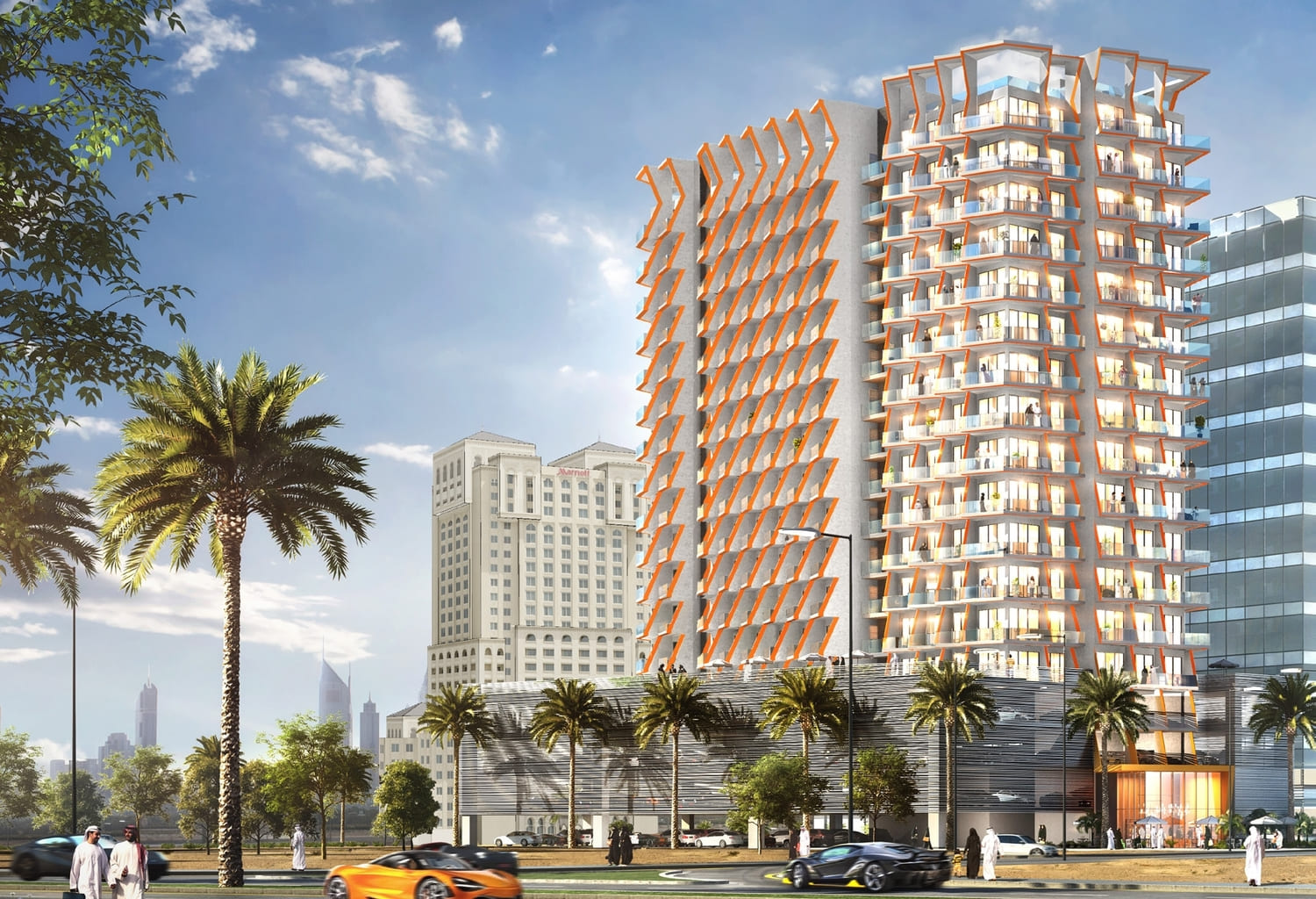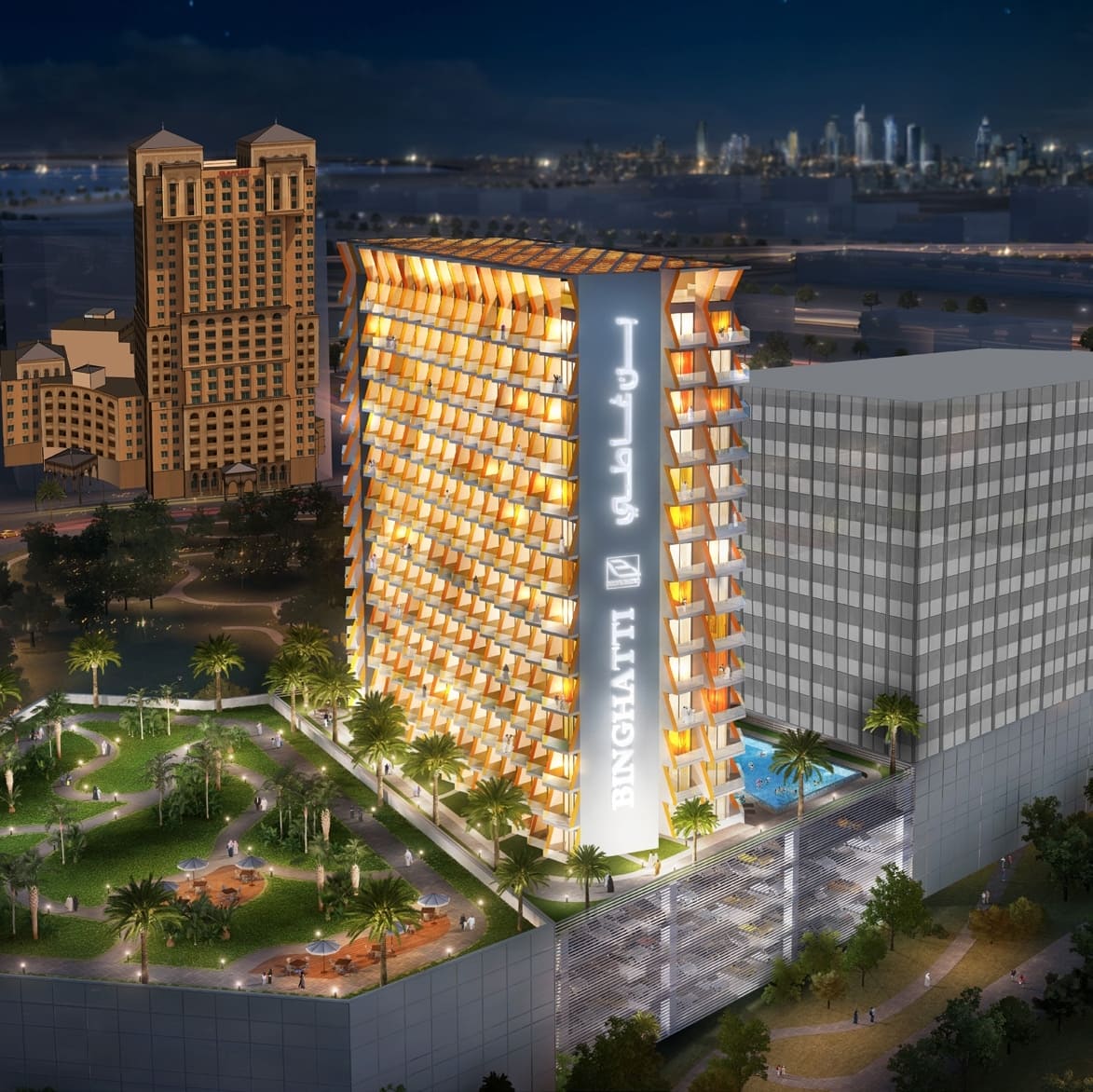 Binghatti Gateway residents enjoy breathtaking panoramic views of the Dubai Creek and the iconic Dubai Skyline. The building’s undulating floors and gently twisted balconies create its iconic wavy appearance, showcasing a modern reinterpretation of traditional ideas relevant to the regional culture and climate. The community ensures excellence, comfort, and prestige for its residents, blending luxury living, natural beauty, and modern urban design.