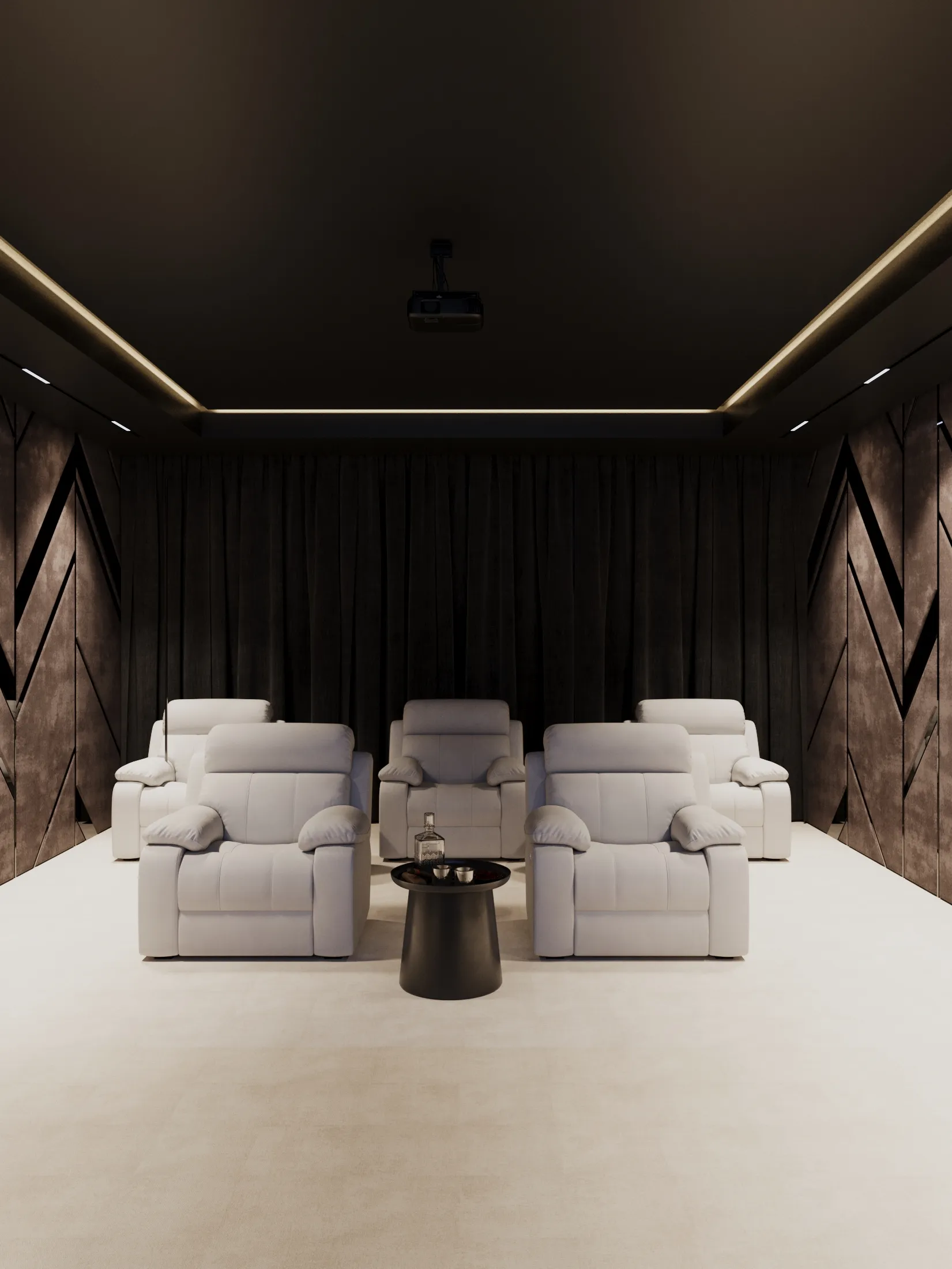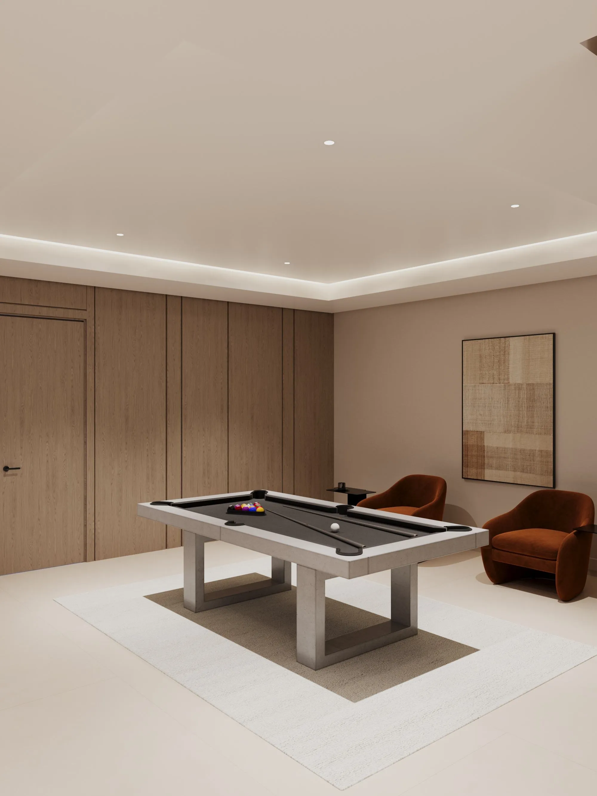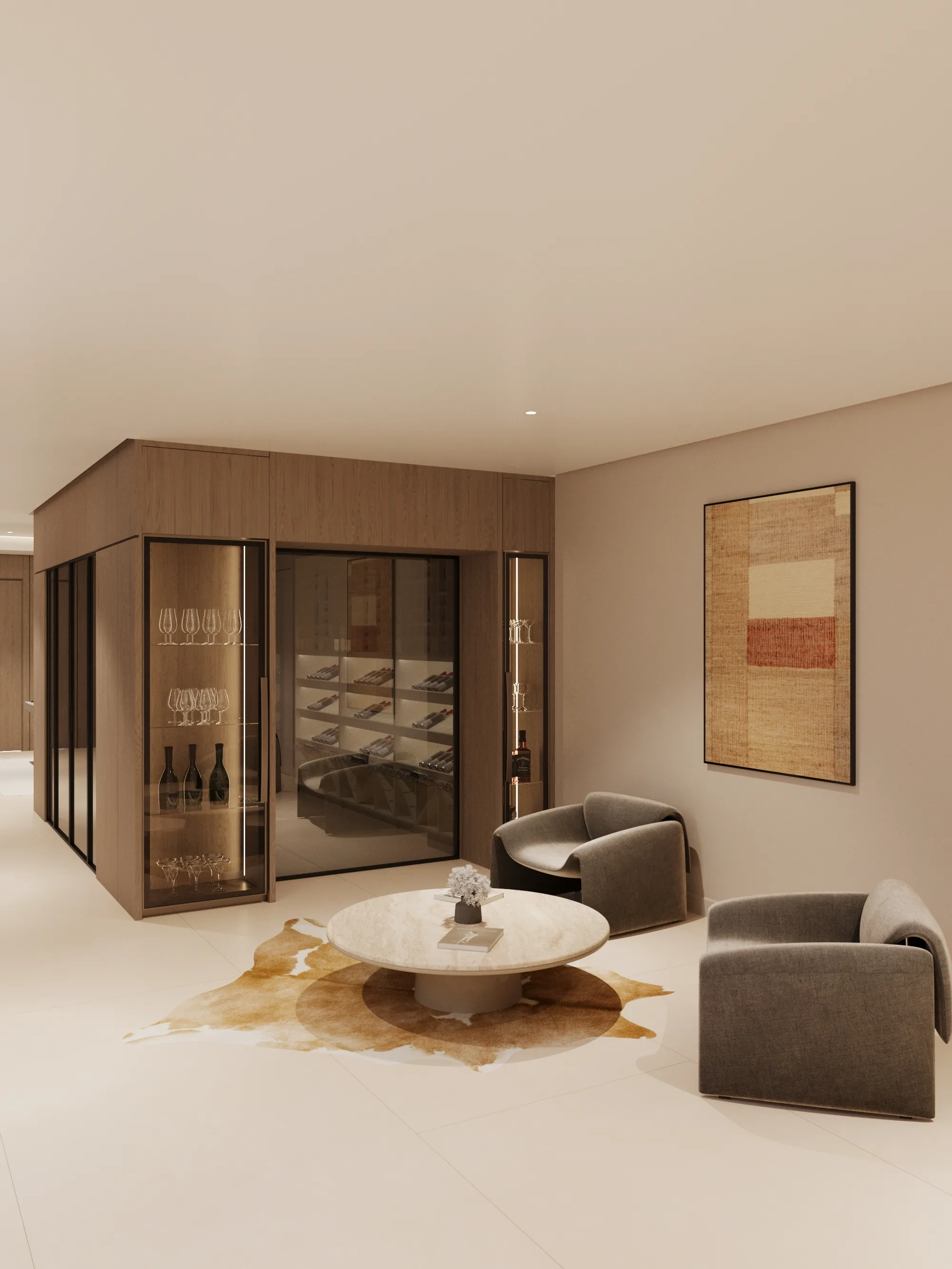 Interior spaces are crafted with a strong focus on material quality, detailing, and sensory comfort. Living areas are defined by dramatic ceiling heights and highlighted by statement lighting features that enhance spatial presence. Floors are finished with premium porcelain surfaces in common areas and hardwood flooring in private rooms, while bespoke wall treatments and architectural panels add depth and character throughout the villa. Kitchens are designed for both presentation and performance, featuring a front-of-house show kitchen alongside a discreet service kitchen, each fitted with premium appliances, custom cabinetry, and refined surface finishes. Furniture and interior styling include designer-selected pieces, plush carpets for acoustic comfort, and carefully curated furnishings that create a warm yet sophisticated living atmosphere.